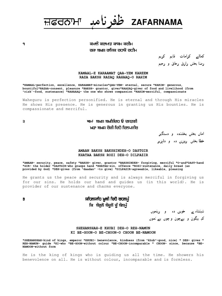 Safarnama and Zafarnama (The Life and Times of Guru Gobind .... 300 years ago, guru gobind singh ji had laid down the circumstances when a person or a nation can pick up the sword against. The lord is perfect in all faculties. Read 24 reviews from the world's largest community for readers. Written in exquisite persian verse, the zafarnama was a defiant message composed by guru gobind singh, the tenth sikh guru, and addressed to the mughal emperor aurangzeb, following a series of fierce battles between the imperial forces and sikh warriors. He is immortal and generous. The victory is of the lord. The lord is one and his word is true. The sacred utterance of the tenth sovereign. Zafarnama (the epistle of victory). This is the most quoted verse of zafarnama. Written in exquisite persian verse, the 'zafarnama' or 'epistle of victory' was a defiant message composed by guru gobind singh, the tenth sikh guru, and addressed to the mughal emperor aurangzeb. Mr rajinder sachar in his book recovery of india gives vivid details of the sacrifices made by the sikhs. Made through a holy book. Discover everything scribd has to offer, including books and audiobooks from major publishers. According to him out of 2175 persons martyred i have used both gurmukhi and roman scripts to write the zafarnama, verse by verse and then give the word meanings in english and finally the.